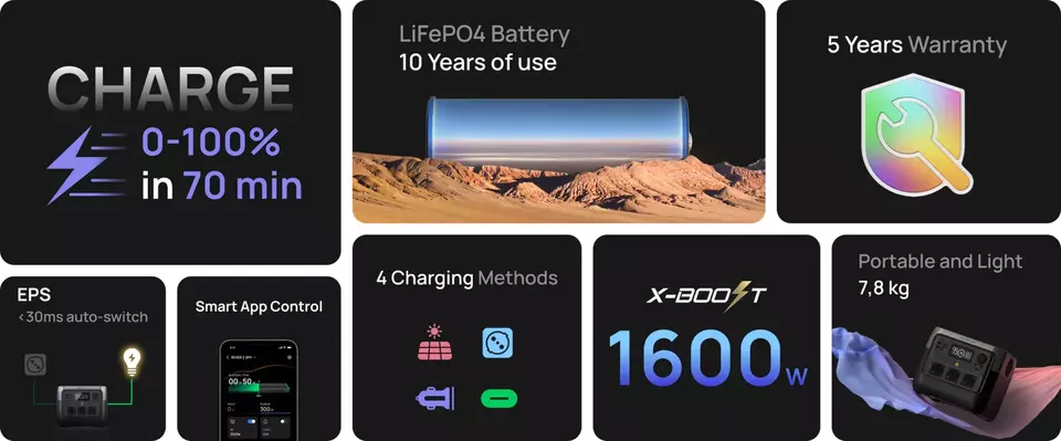 With upgraded long-lasting LFP battery chemistry at its core, charge and empty RIVER 2 Series over 3000 times. That's pretty much 10 years of everyday use1 and 6x longer than the industry average. With LFP cells, RIVER 2 Series is safe, durable, and highly efficient, even in warm temperatures.